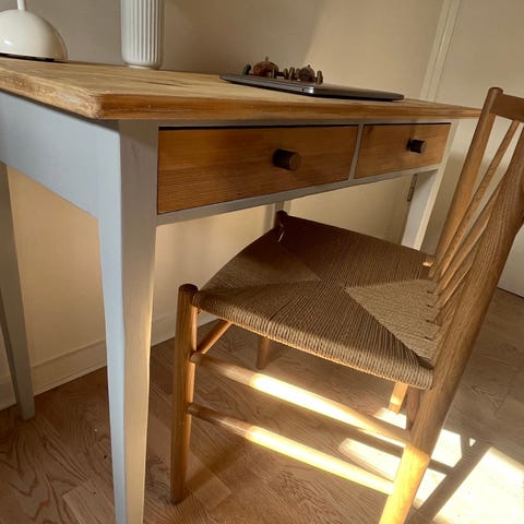 Karl Andersson & Söner (Göran Malmvall): skrivebord fra dette svenske firma, udført i mahogni med messingbeslag og 4 skuffer indfældet i sargen. Der er lidt skjolder som ses på foto og lidt riser på siden men står flot og smuk skuffer er lidt seje at trække ud med strin hjælper