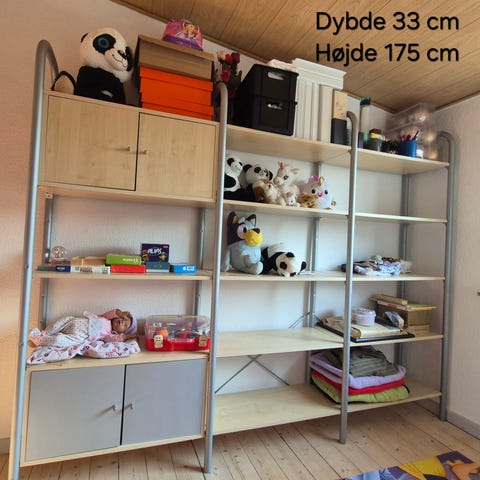 Reol væghængt reolsystem i træ med flere åbne hylder og integrerede skuffer og skabe. Systemet består af lodrette paneler med justerbare hylder, så indretningen kan tilpasses efter behov. Overfladen har træfinér med tydelig årestruktur i en mørk, varm tone. Nederst er der lukkede opbevaringsmoduler med skuffer og skabe, egnede til bestik, service eller andre mindre genstande. Reolen er velegnet til opbevaring og udstilling af bøger, dekoration og hverdagsting i stue eller spisestue.