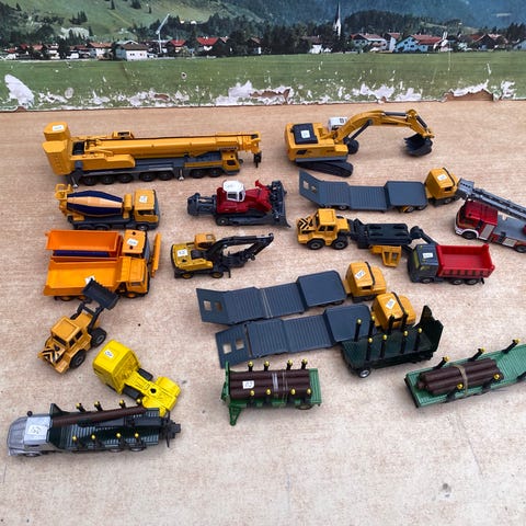 Sæt med legetøjsentreprenørmaskiner bestående af traktor og flere læssemaskiner i plast. Sættet indeholder blandt andet en blå traktor med vogn samt gule maskiner med skovl foran. Egnet som legetøj til børn, der leger med byggeplads- og landbrugstemaer. Farverne er primært gul og blå, og materialet fremstår som hård plast.