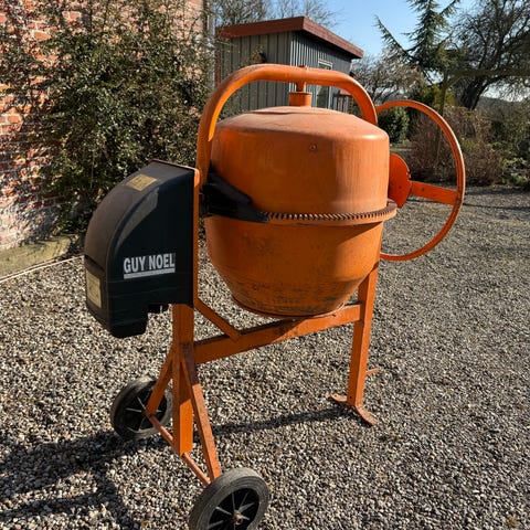 Har denne blandemaskine til 230v og to murebukke til overs efter en renovationopgave, som jeg ikke længere får brug for.