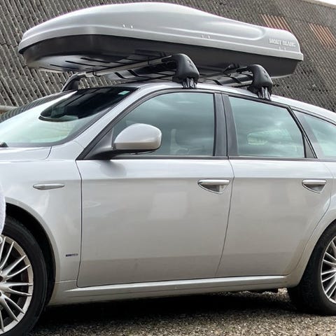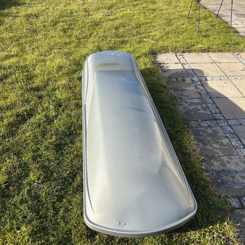 Mont Blanc Vista 540 tagboks i sølvfarvet hård plast. Aerodynamisk formet boks til montering på tagbøjler på personbil. Velegnet til ekstra bagage, ski eller udstyr på bilferier. Åbnes og lukkes med lås (nøgle ikke synlig på billederne). Monteres på tværstænger/tagbøjler, som ses på billederne, med passende beslag afhængigt af bil og bøjletype.