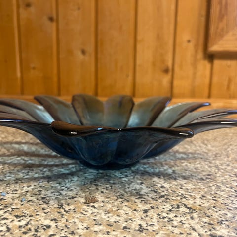 super flot unik skål/fad/slik skål, kan bruges til meget ellers som pynt i sig selv, glas i kongeblå farve model som blomster, str. H .6 cm. x 28 Ø cm. ny kan hentes for 60 kr. per stk. (har 2 stk.) sendes gerne privat.