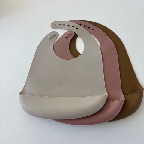 Sættet indeholder to hagesmækker lavet af silikone, ideel til småbørn. Hagesmækkerne har justerbare lukninger og en praktisk lomme til opsamling af mad, som gør dem funktionelle og lette at rengøre. Designet er enkelt og stilrent.