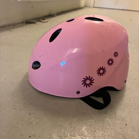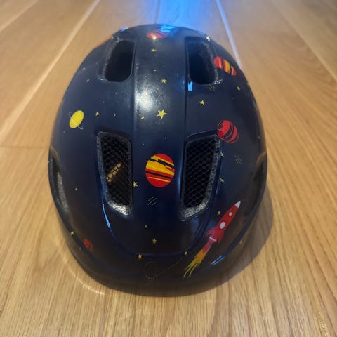Denne cykelhjelm til børn har et farverigt rummetema med rumskibe og stjerner. Den er udstyret med ventilationshuller for bedre luftcirkulation og en justerbar strop for sikker pasform. Hjelmen har også en baglys for øget synlighed i mørke. Den passer til hovedstørrelser fra 46 til 51 cm i omkreds og har en diameter på 18 cm.