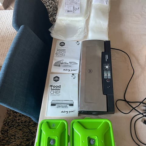 FoodSaver vakuumpakker er en maskine, der bruges til at pakke fødevarer i lufttætte poser for at forlænge deres holdbarhed. Den har en rustfri stålfront med et sort design og flere funktionstaster til betjening, som er synlige på toppen. Maskinen har et kompakt design med målene 41x24 cm, hvilket gør den nem at opbevare i køkkenet. Tags: vakuummaskine, fødevareopbevaring, køkkenmaskiner.
