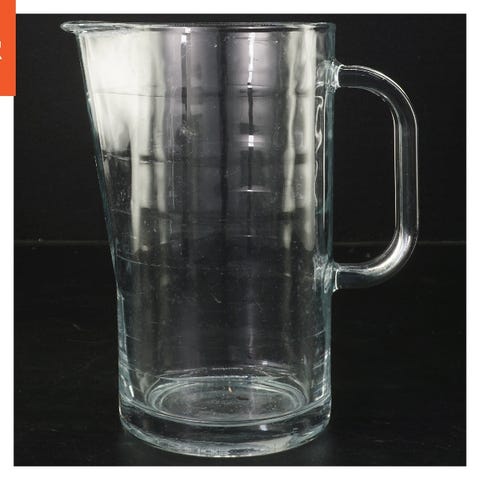 En gennemsigtig glaskande med en sort hank. Kanden har en hældetud, og dens mål er 14x12 cm. Der er et prismærke på bunden af kanden.