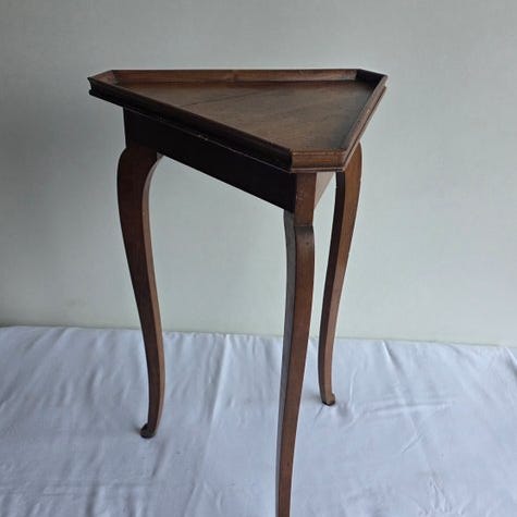 Elegant træsidebord i klassisk stil med top i valnøddetræ og mahogni-omrids, står på fire slanke Cabriole-ben, fra det 20. århundrede, oprindelse Storbritannien; mål 44 x 33,5 x 33,5 cm; i god brugt stand med let slid. Klik på den blå "gå til varen" knap, for at købe eller byde på denne vare. Den samlede pris vil blive vist inden du afgiver dit bud.