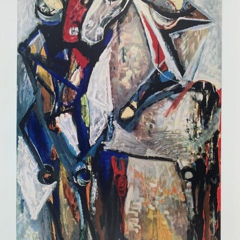 Smuk, udtryksfuld kunsttryk af Franz Marc i formatet 50 x 100 cm med titlen Kleine gelbe Pferde (Detail). Værket er et højkvallitets offsettryk på fast papir og i meget god stand.