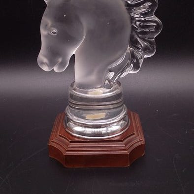 En fantastisk papirvægt i form af et hestehoved, designet som et hestehoved. Fremstillet i opalescens Boheme-krystal. Solid krystal tung genstand