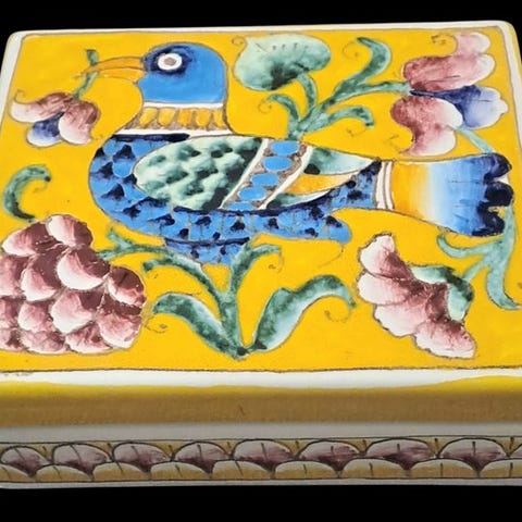 Raffineret cirkulær æske i lak (papier-mâché), ægte eksempel på russisk håndværksmæssig excellence fra den sovjetiske periode. Låget er helt håndmalet med teknikken temperaægge og færdigt med detaljer i bladguld, forestillende en dynamisk scene af en ung mand med en hest.