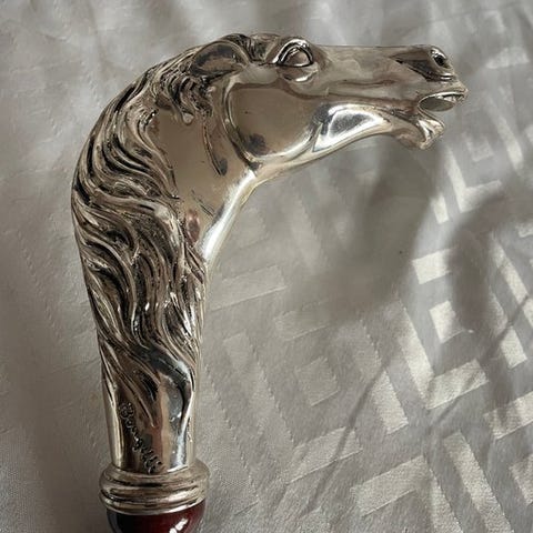 Gåstok i træ med messingbeslag og et håndtag i form af et hestehoved i messing, italiensk oprindelse, Art Nouveau, anden halvdel af det 20. århundrede, højde 97 cm, bredde 7,5 cm. Klik på den blå "gå til varen" knap, for at købe eller byde på denne vare. Den samlede pris vil blive vist inden du afgiver dit bud.