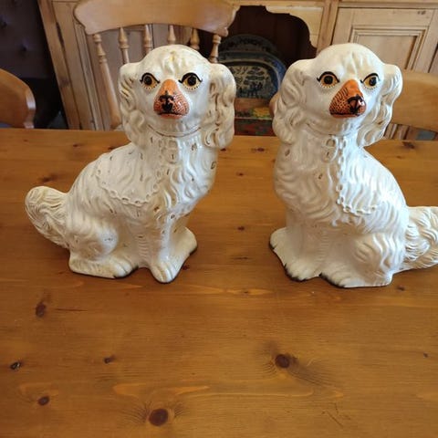 Engelsk Staffordshire Spaniel keramikfigurer, 11 cm høj, 10 cm bred, 6 cm dyb, fra 1950–1960, i god brugt stand med mindre slid og pletter. Klik på den blå "gå til varen" knap, for at købe eller byde på denne vare. Den samlede pris vil blive vist inden du afgiver dit bud.