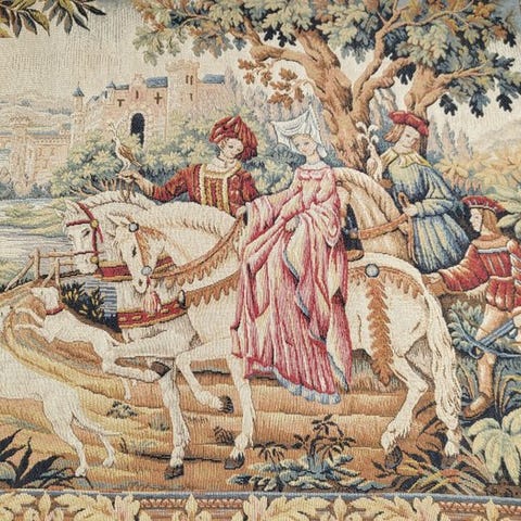 Antikt vævet jagttæppe i renæssance stil i uld, lavet i Frankrig, ca. 1950–1960, 190 × 116 cm, i god brugt stand med mindre tegn på slitage. Klik på den blå "gå til varen" knap, for at købe eller byde på denne vare. Den samlede pris vil blive vist inden du afgiver dit bud.