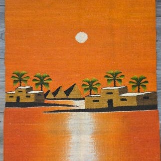 til salg står et dekorativt, håndvævet tekstil-vægophæng (eller bordløber), der viser to symmetriske scener med exotiske fugle (flamingoer/hejre) i et kystlandskab med palmer. Stykket kendetegnes ved sin fine vævning og de omkredsende frynser.
