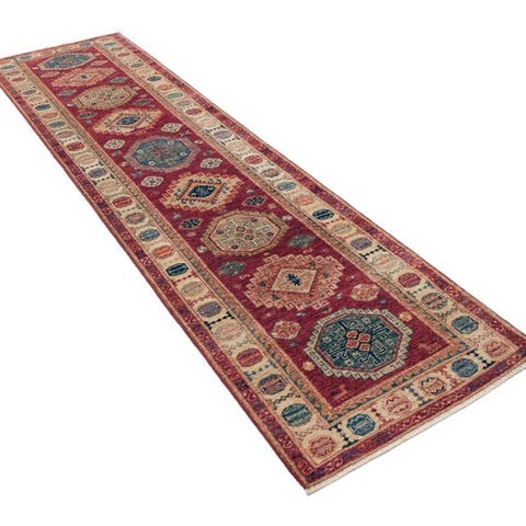 Smukt håndknyttet designer-løber med klassisk Samarkand-mønster. Den rolige naturfarve suppleres stilfuldt af geometriske ornamenter i rød, blå, turkis og guld. Hermed virker tæppet levende, men stadig behageligt harmonisk – ideelt til gange, entré eller ved siden af sengen.
