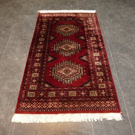 Oprindelse: Pakistan; Model: Buchara art deco håndvævet tæppe. Klik på den blå "gå til varen" knap, for at købe eller byde på denne vare. Den samlede pris vil blive vist inden du afgiver dit bud.