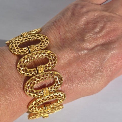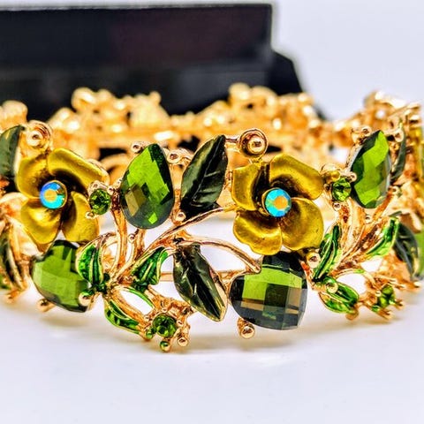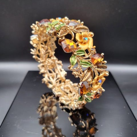 Joan Rivers forgyldt armring til kvinder, i fremragende stand, samlet vægt 32 g, diameter 7 cm, inlagt med fuchsia og andre flerfarvede krystaller, der danner kronblade og blomster, underskrevet Joan Rivers, betegnet « Le Jardin de Giverny ». Klik på den blå "gå til varen" knap, for at købe eller byde på denne vare. Den samlede pris vil blive vist inden du afgiver dit bud.