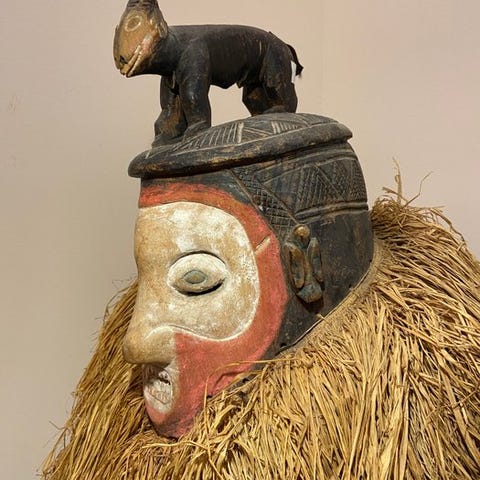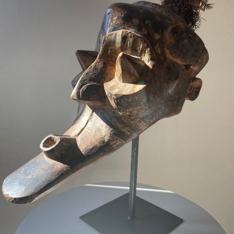 Kuba hjelmmaske fra DR Congo, midten af det 20. århundrede, lavet af træ, kobber, bronze og dyrehår, 35 cm høj, i god stand, provenance fra privat samling med Berthe Hartert og Argiles Collection Barcelona. Klik på den blå "gå til varen" knap, for at købe eller byde på denne vare. Den samlede pris vil blive vist inden du afgiver dit bud.
