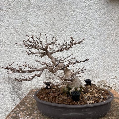 Fantastisk eksemplar af kinesisk elm med mangeårigt avanceret arbejde. Fremhæver sin robuste, buede stamme med en naturlig bevægelse, meget elegant. Grenopbygningen er velstruktureret i niveauer, hvilket skaber en tæt og afbalanceret krone.