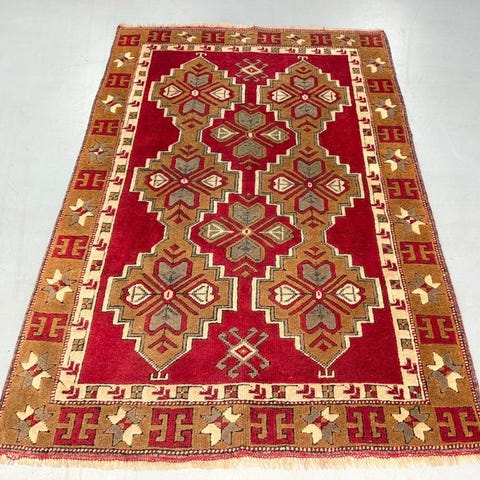Autentisk Anatolisk kazak-tæppe, håndknyttet i regionen Kars, Tyrkiet. Dette tæppe er kendt for sine stærke geometriske mønstre, dybe farver og robuste udtryk, kendetegnende for den traditionelle Kazak-stil.