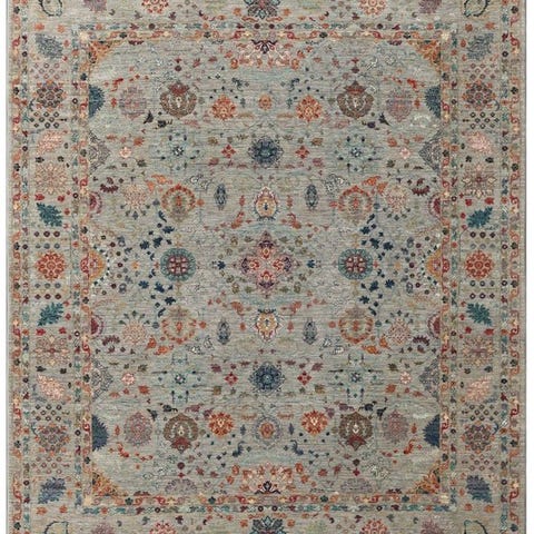 Elegant håndknyttet løber i friske, lyse nuancer. Den blide turkis- og blå bund suppleret af fint udformede florale ornamenter giver en let, venlig rumvirkning. Den harmoniske kantbård med klassiske motiver giver tæppet en tidløs karakter og gør det ideelt til gangen, entréen eller snævre rum.