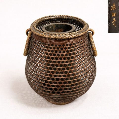 Denne bambusblomsterbeholder er ideel til ikebana-praksis, teceremonimiljøer eller som et unikt dekorativt anliggende i japansk-inspirerede interiører. Den naturlige aldring og patina af bambusen bidrager til dens varme, wabi-sabi-karakter.