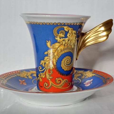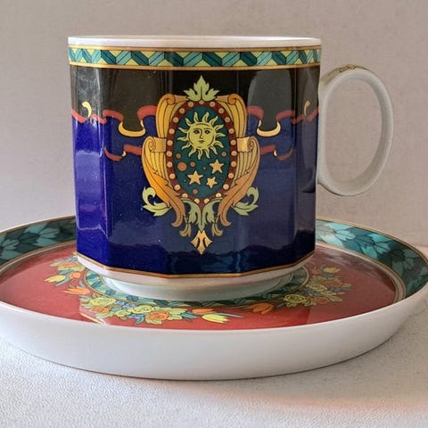 Versace ☆Le Roi Soleil ☆ 1993 espressokop med blå baggrund, et solhoved, stjerner, ranker, blomster og aztekiske mønstre. Underkoppen har hovedfarven rød, hvor frugter og blomster danner en ring.