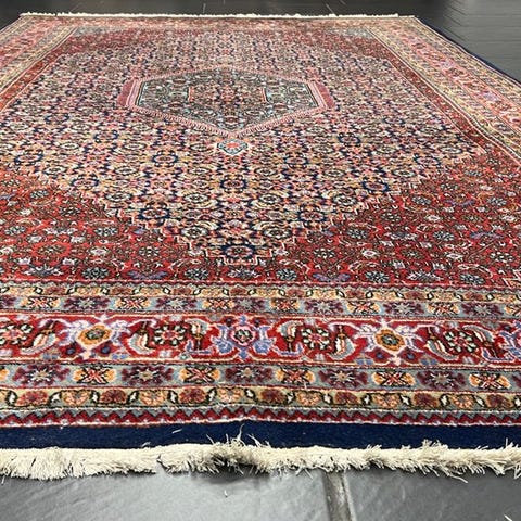 Oprindelse: Indien; håndknyttet Bidjar Orient tæppe med uld på bomuldsvæv, måler 296 × 196 cm og vejer ca. 25 kg, i god stand. Klik på den blå "gå til varen" knap, for at købe eller byde på denne vare. Den samlede pris vil blive vist inden du afgiver dit bud.