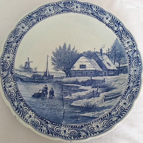 Importante og dekorativ plade i Delft blå og hvid keramik i stor størrelse, helt håndmalet med et stemningsfuldt hollandsk landskab, der viser en hestevogn foran en gård omgivet af et vinterlandskab. Scenen er udført med den traditionelle koboltblå teknik på tinbelagt glasur, typisk for Delft-keramik, med en detaljeret komposition: fint forgrenede