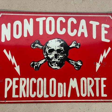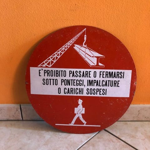 Original italiensk sikkerhedsskilte til industrielt brug, lavet af støbt metalletplade, kommer fra et industrielt miljø eller mekanisk værksted.