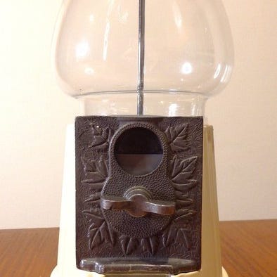 Smuk og sjælden dispenser til kugler og tyggegummi, populær i 60'erne/70'erne. Kroppen i rødt malet metal og glasampul. Fungerer fuldt ud med blot indføring af mønt, der tillader udløset af kuglen. Udløsningsfangst via gennemsigtig kuppel. Kugler medfølger ikke.