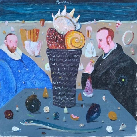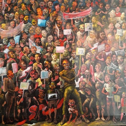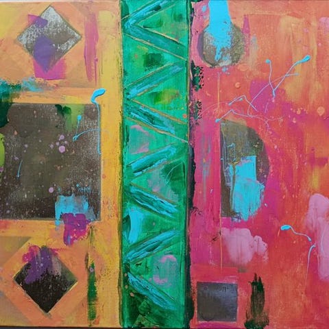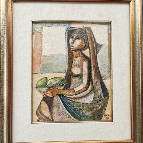 Leveres med sin originale ramme i aluminium, hvor maleriet er udstillet åbenlyst.