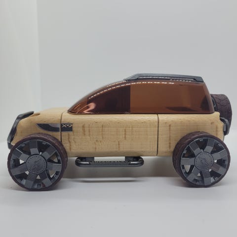 Automoblox er lavet i solidt træ med hjul og tag af polykarbonat plast. Der er gummidæk på hjulene.
