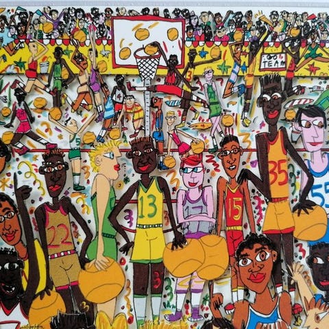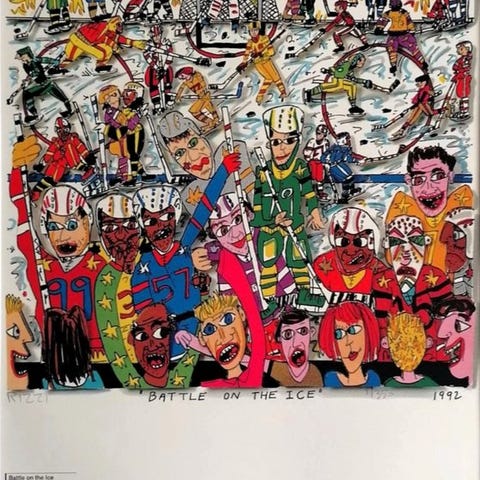 James Rizzi (1950–2011), after, Too many People going Sking, offsettryk, begrænset udgave, 1995, solgt med ramme. Klik på den blå "gå til varen" knap, for at købe eller byde på denne vare. Den samlede pris vil blive vist inden du afgiver dit bud.