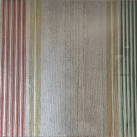 Akryl på ridset og spatulabehandlet plade. Materielt værk med stor gennemslagskraft.