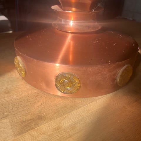 Pendel, Retro lampe, kobber med hvid glas indsats, stofledning, diameter 26 cm, højde 15 cm.