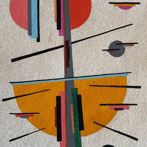 Kompositionen viser et bord med flasker, frugt og brugsgoder, opbygget i et lagdelt og geometrisk spil af linjer og transparente flader. Former nedbrydes og genopbygges i et kubistisk-inspireret billedsprog, hvor genkendelighed og abstraktion subtilt balancerer. De varme oker-, lyserøde- og grå nuancer giver værket et tilbagelænet, harmonisk udtryk.
