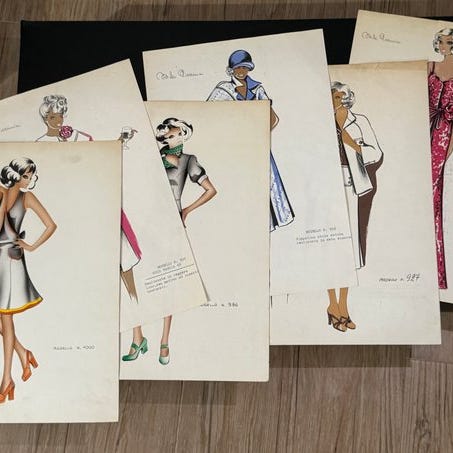 Lotto af 5 originale modelfigurer i italiensk mode af Mila Piccinini – 70’erne – nummererede modeller med tekniske tekster – italiensk skrædderarkiv