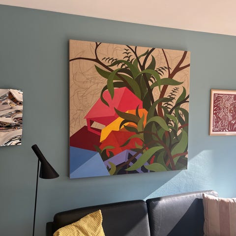Dette kunstværk præsenteres som et overbevisende eksempel på nutidig abstrakt ekspressionisme, der blander elementer af udtryk, abstraktion og action painting. Kompositionen opnås gennem lagdelte, gestuelle farveapplikationer, hvilket skaber en stærk følelse af dybde, bevægelse og følelsesmæssig intensitet.