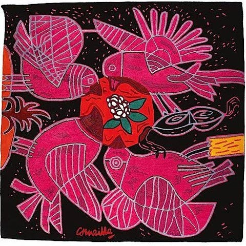 Et lignende værk af samme komposition gengives på side 202 i bogen "Corneille : Un oiseau précoce", Marjet den Bieman, Galerie Den Bieman de Haas, Amsterdam, 1997. (se sidste billeder) Bogen medfølger ikke.