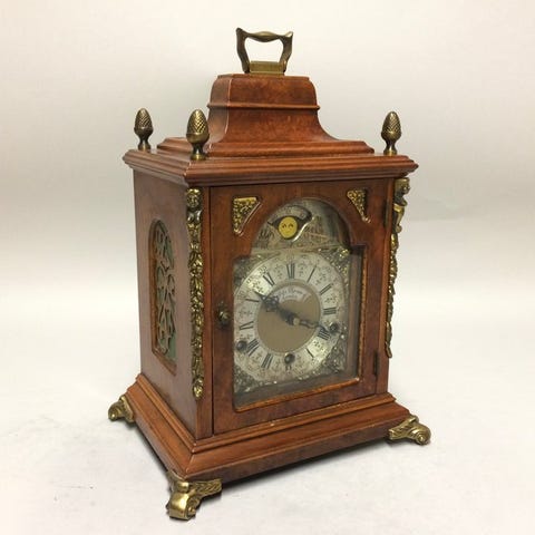 Art Deco bordururværk med ot-dages mekanisk gang, kabinet af messing og træ, fremstillet i Tyskland i slutningen af 1930’erne/40’erne, BIM-BAM slag på tre gongstenger og optrækningsnøgle. Klik på den blå "gå til varen" knap, for at købe eller byde på denne vare. Den samlede pris vil blive vist inden du afgiver dit bud.