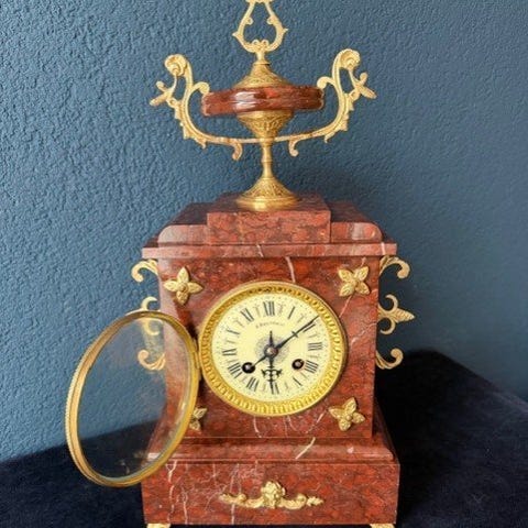 Hej, her er endnu et toptilbud fra tidsforhandleren. En pragtfuld marmoreret fransk pendule med bronzebroderier. Urværket er sonisk rengjort og gennemgået, det løber og slår udmærket.