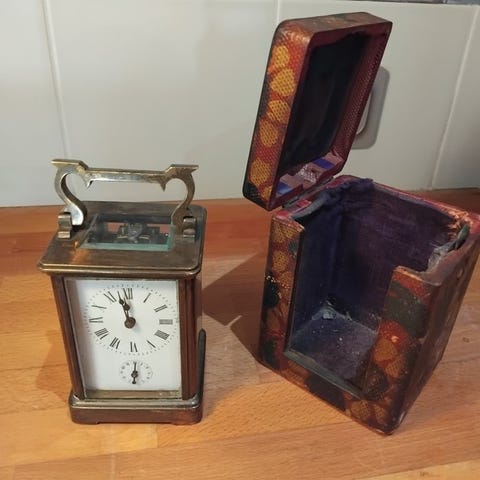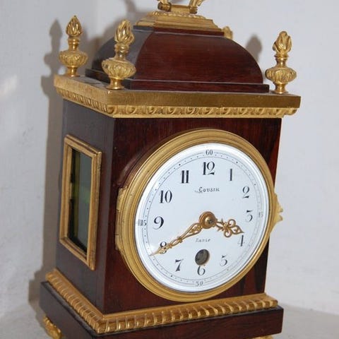 tyk kvalitets bronze forgyldt vognur, med repetitionsværk og vekkerur, slag på gong, urværk med originalt escapement, signeret Leroy, Boulevard de la Madeleine Paris, sølvbelagt talerring