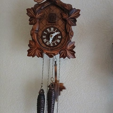 Et træsort Black Forest kikururur med messingkomponenter, fra 1960–1970, mekanisk urværk, 1-dages gangreserve, slag hvert halvtime med en gong, udskåret løv og tre fugle, i god brugt stand og i funktion, 48 cm høj, 35 cm bred, 20 cm dyb, vægt 6 g, oprindelse Tyskland. Klik på den blå "gå til varen" knap, for at købe eller byde på denne vare. Den samlede pris vil blive vist inden du afgiver dit bud.