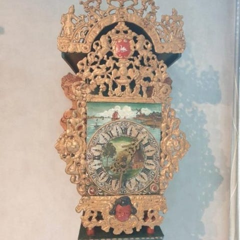 Friesisk stolur fra Hollandene, dateret 1970–1980, med mekanisk værk og længerevarende gangreserve, fremstillet af træ og messing, 75 cm høj, 37 cm bred, 15 cm dyb, vejer 3 kg, halvtime slag på en klokke, i god brugt stand. Klik på den blå "gå til varen" knap, for at købe eller byde på denne vare. Den samlede pris vil blive vist inden du afgiver dit bud.