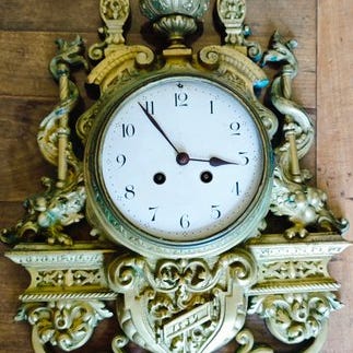 Louis XV-stil Carteluhr fra Frankrig fra det 19. århundrede (ca. 1850–1900) med forgyldt bronze og tortoiseskalleimit, mekanisk otto-dages urværk, slag på hele og halve timer med klokke og gong, dimensioner 53 × 27 cm, i god stand. Klik på den blå "gå til varen" knap, for at købe eller byde på denne vare. Den samlede pris vil blive vist inden du afgiver dit bud.