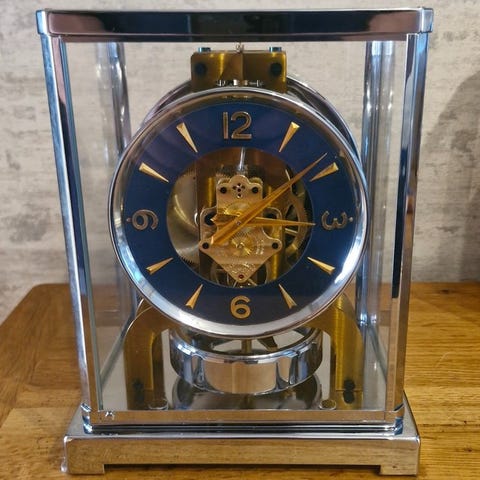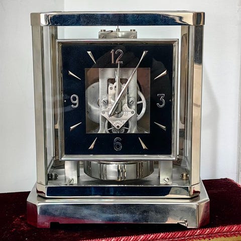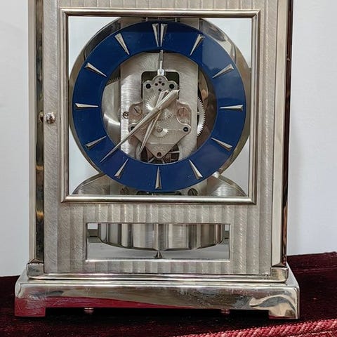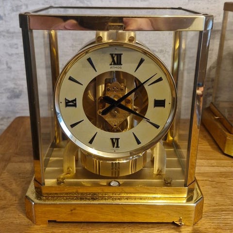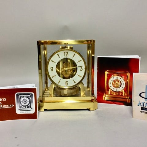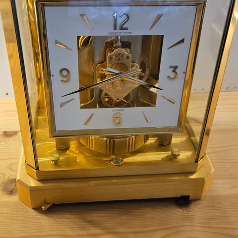 Forgylldt Atmos-ur fra Jaeger‑LeCoultre, kaliber 526‑6 med 15 juveler, dateret 1970‑1980, mekanisk Atmos‑urværk, selvoptrækkende ved temperaturændringer, målene 24 × 21 × 16 cm, vægt 4,7 kg, i god brugt stand med mindre aldersrelaterede tegn, schweizisk fabrikat. Klik på den blå "gå til varen" knap, for at købe eller byde på denne vare. Den samlede pris vil blive vist inden du afgiver dit bud.