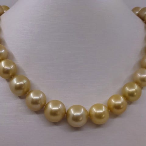Denne halskæde har en smuk blanding af 11 hvide og gyldne sydhavsperler (Australien), 6 grønne Tahiti-perler (Fransk Polynesien) og 17 lyserøde Edison ferskvandsperler (Sydøstasien).