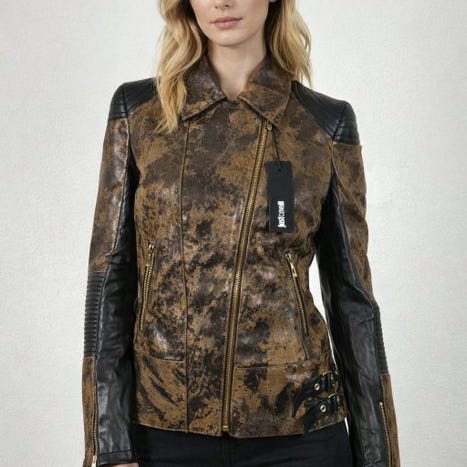 Ekstremt biker-jakke signeret Roberto Cavalli – Just Cavalli-linjen, et ikonisk plagg der perfekt forener rockkarakter og den raffinement, der kendetegner det italienske hus.