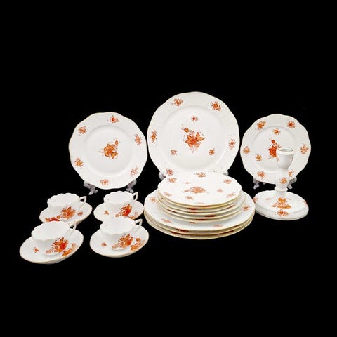Et majestætisk Herend Nanking Bouquet-mønstret middagsæt i fejlfri stand. Hvert stykke er perfekt uden ridser, slid eller reparationer og viser den højeste kvalitet af Herend-håndværk.